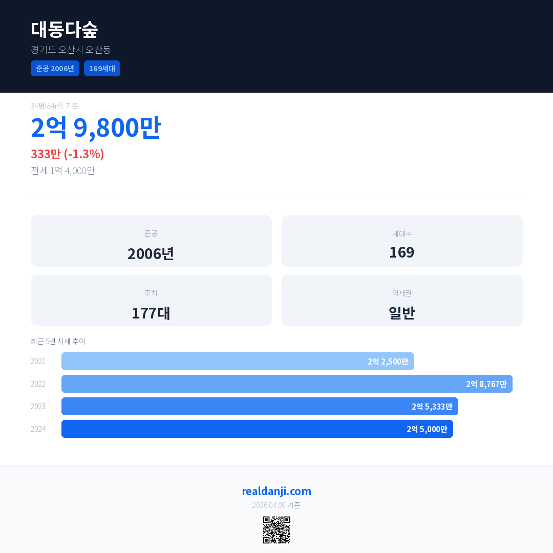대동다숲 국민평형 기준 2024년 평균 거래가는 2억 5,000만으로, 전년 대비 1.3% 하락 했습니다.