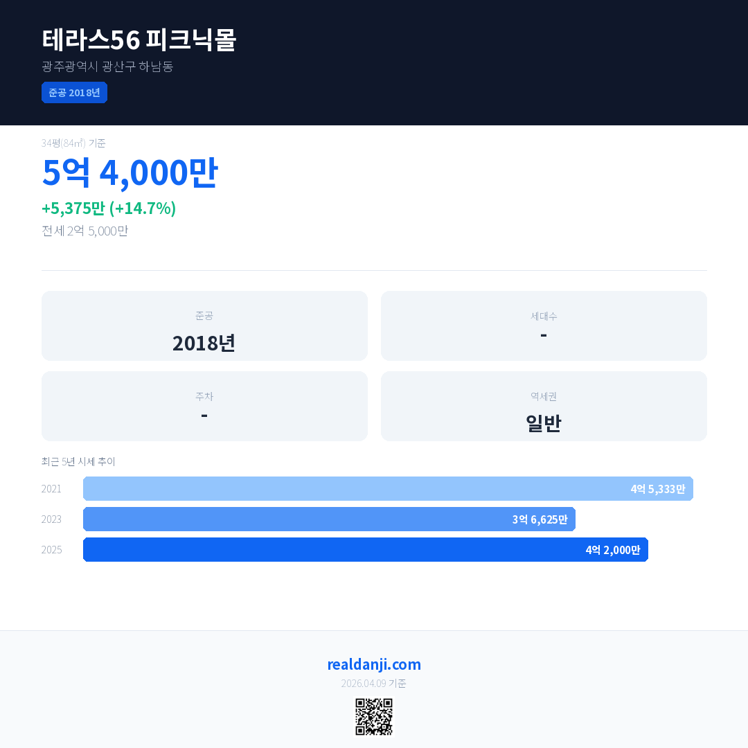테라스56 피크닉몰 국민평형 기준 2025년 평균 거래가는 4억 2,000만으로, 전년 대비 14.7% 상승 했습니다.