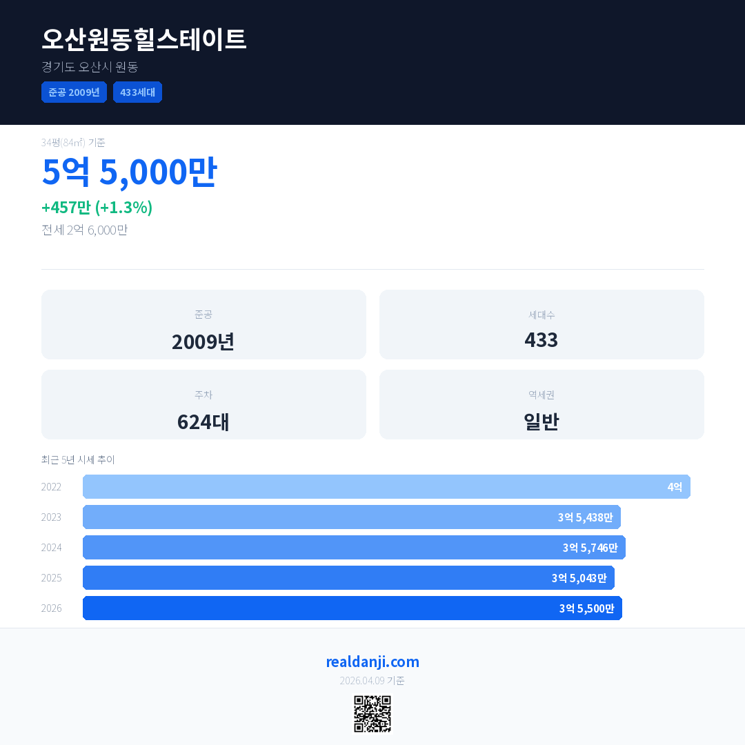 오산원동힐스테이트 최근 거래가는 5억 5,000만입니다. (2026-03)