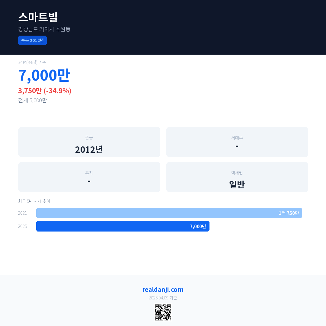 스마트빌 국민평형 기준 2025년 평균 거래가는 7,000만으로, 전년 대비 34.9% 하락 했습니다.