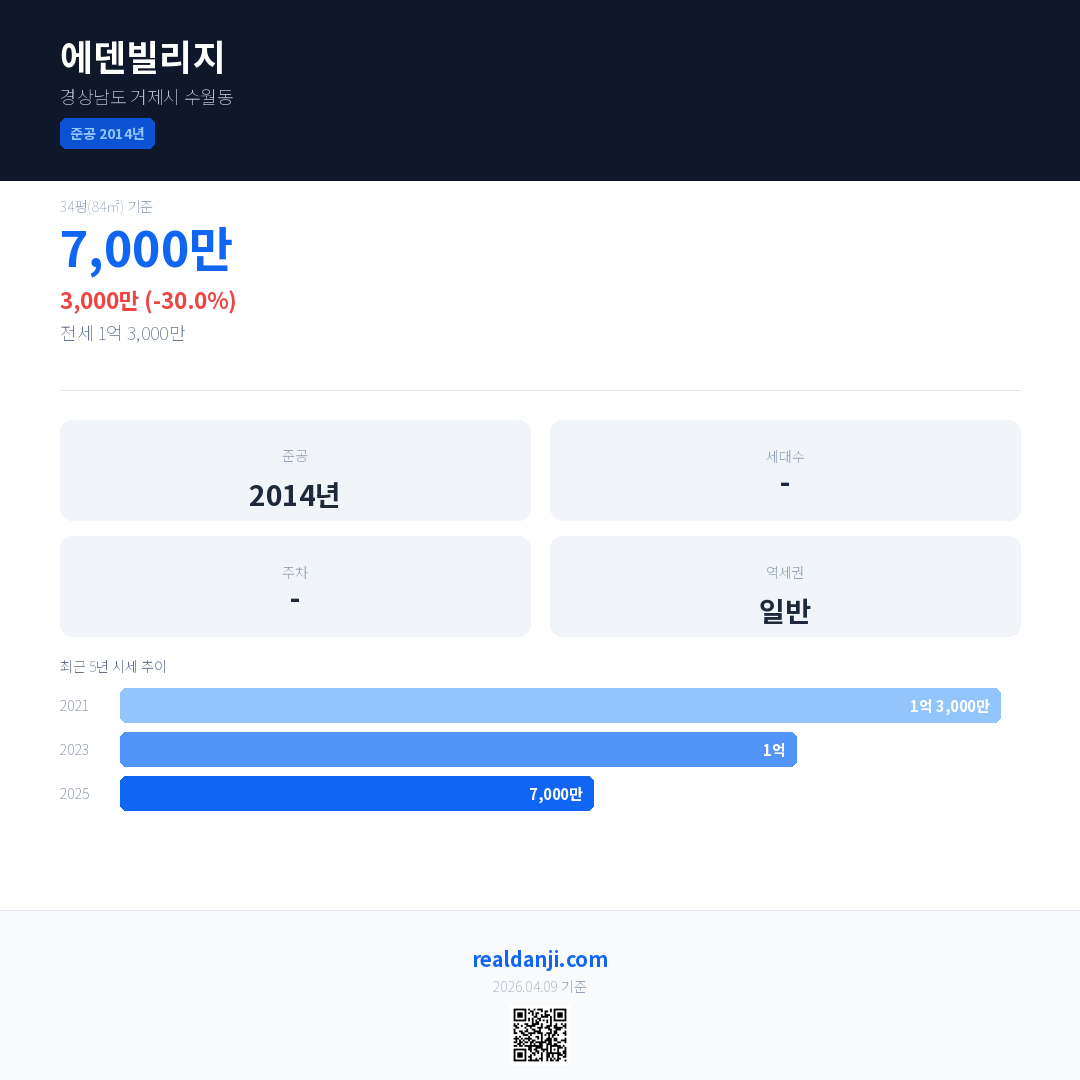 에덴빌리지 국민평형 기준 2025년 평균 거래가는 7,000만으로, 전년 대비 30.0% 하락 했습니다.