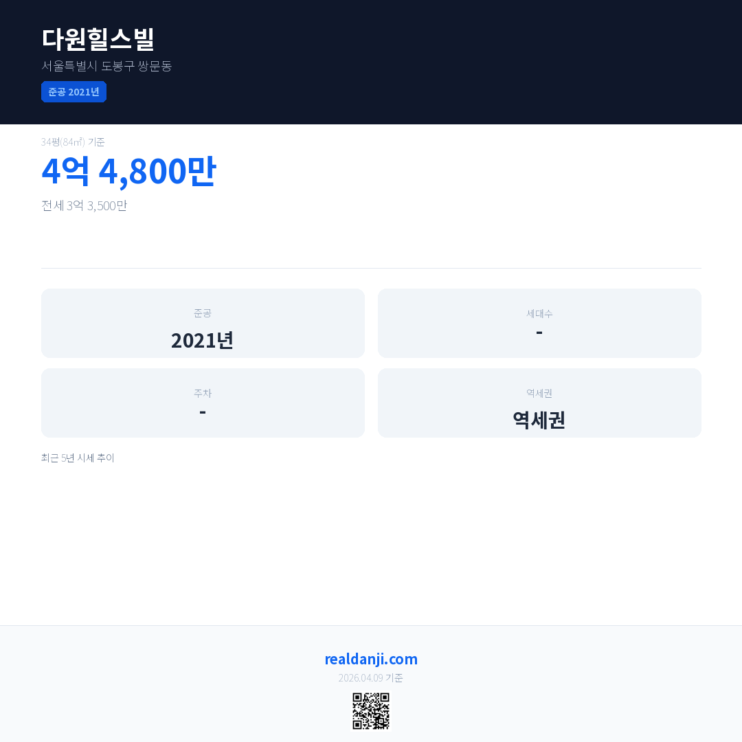 다원힐스빌 최근 거래가는 4억 800만입니다. (2026-04)