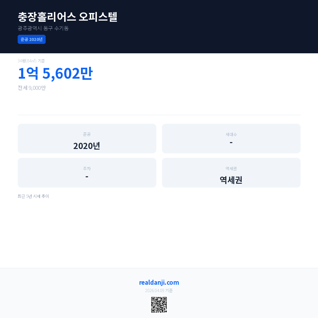 충장홀리어스 오피스텔 최근 거래가는 1억 5,602만입니다. (2024-11)