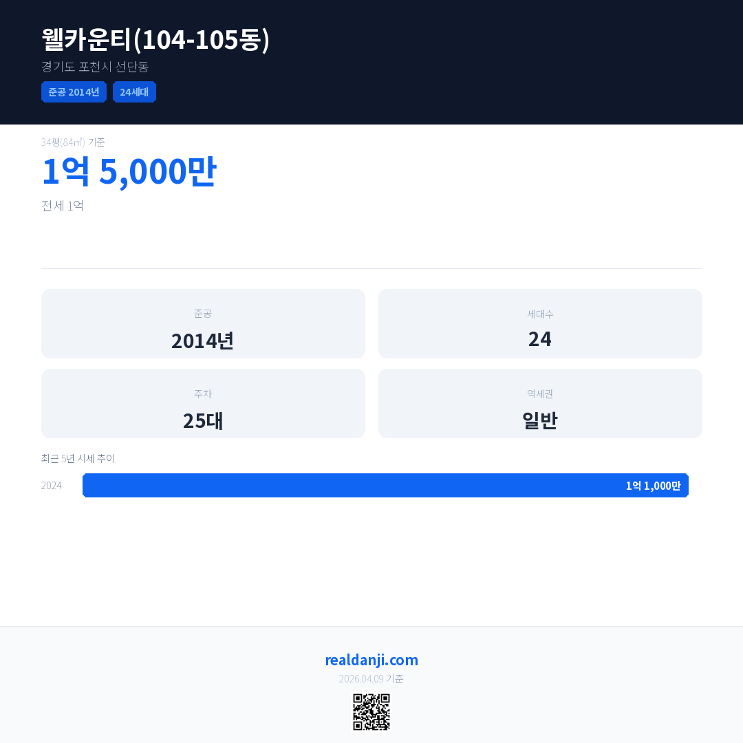 웰카운티(104-105동)은(는) 2014년에 준공되었으며, 현재 12년차입니다. 총 24세대 규모입니다.