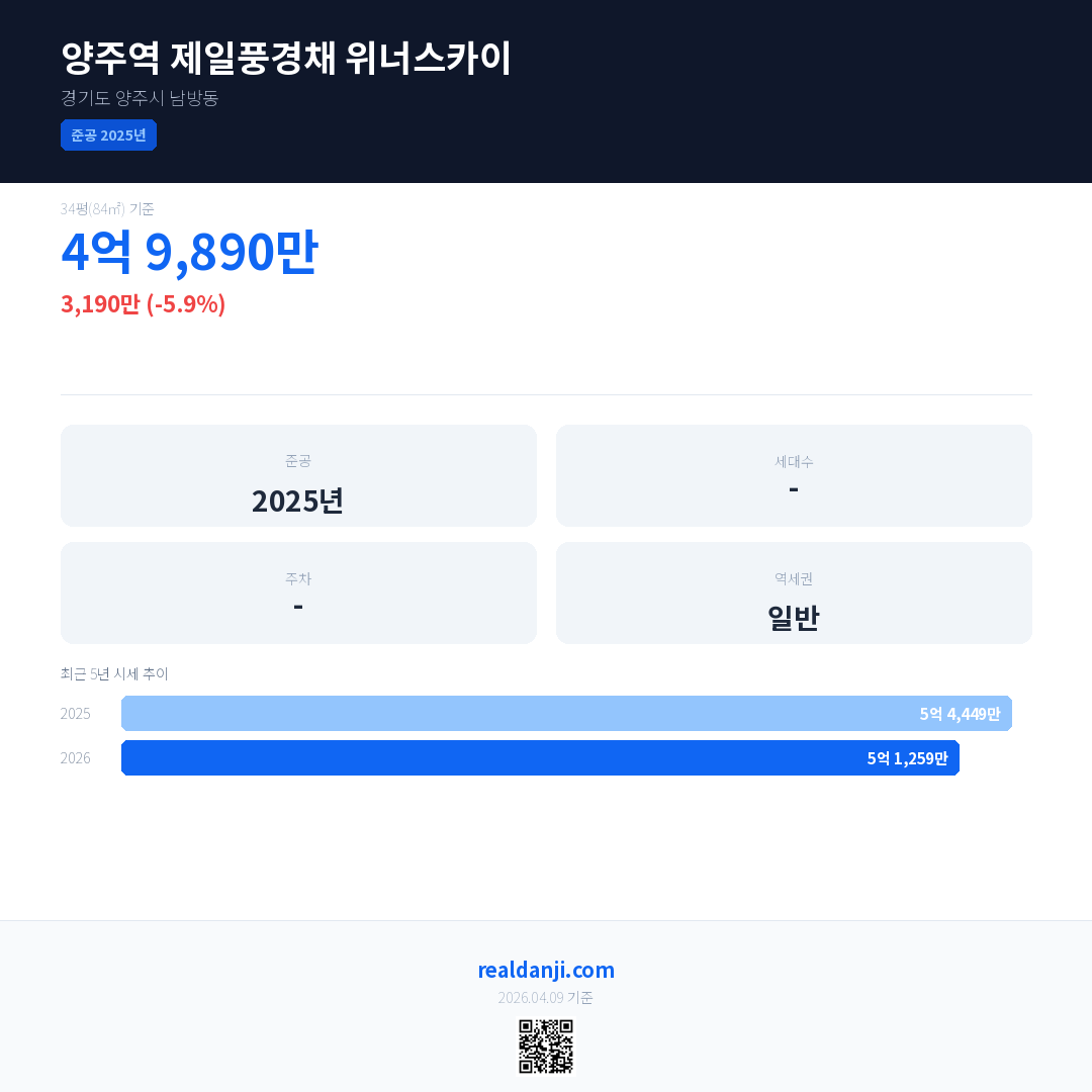 양주역 제일풍경채 위너스카이 국민평형 기준 2026년 평균 거래가는 5억 1,259만으로, 전년 대비 5.9% 하락 했습니다.