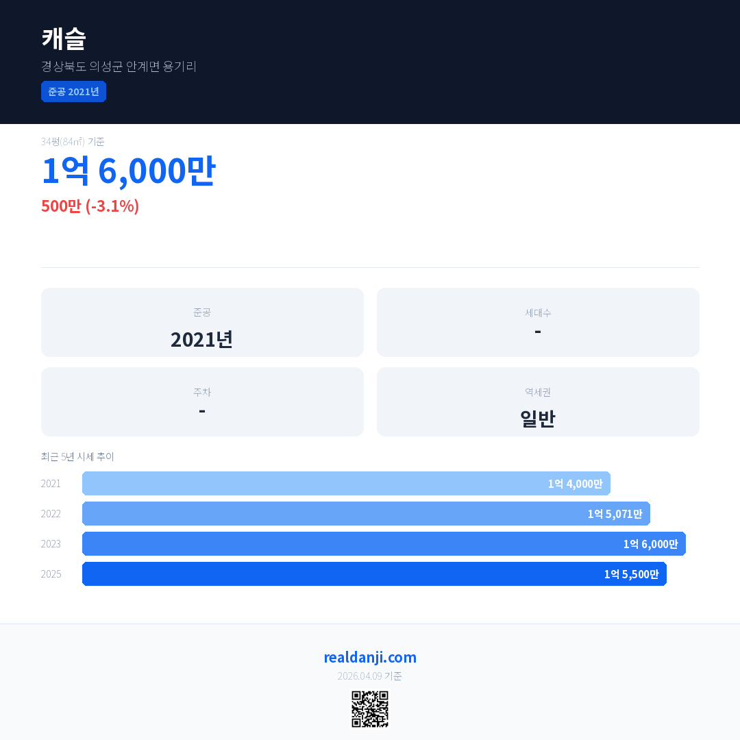 캐슬 국민평형 기준 2025년 평균 거래가는 1억 5,500만으로, 전년 대비 3.1% 하락 했습니다.