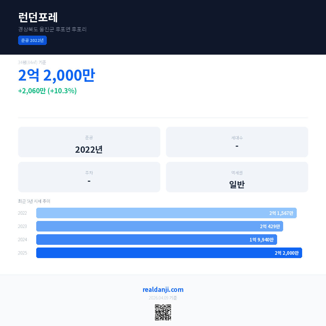 런던포레 국민평형 기준 2025년 평균 거래가는 2억 2,000만으로, 전년 대비 10.3% 상승 했습니다.