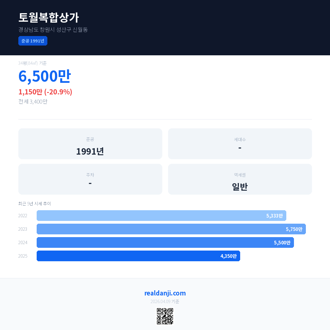 토월복합상가 국민평형 기준 2025년 평균 거래가는 4,350만으로, 전년 대비 20.9% 하락 했습니다.