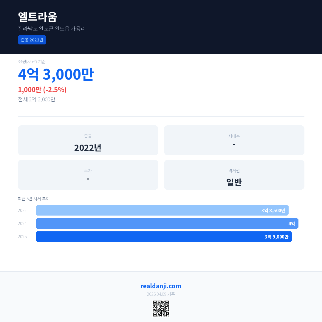 엘트라움 국민평형 기준 2025년 평균 거래가는 3억 9,000만으로, 전년 대비 2.5% 하락 했습니다.