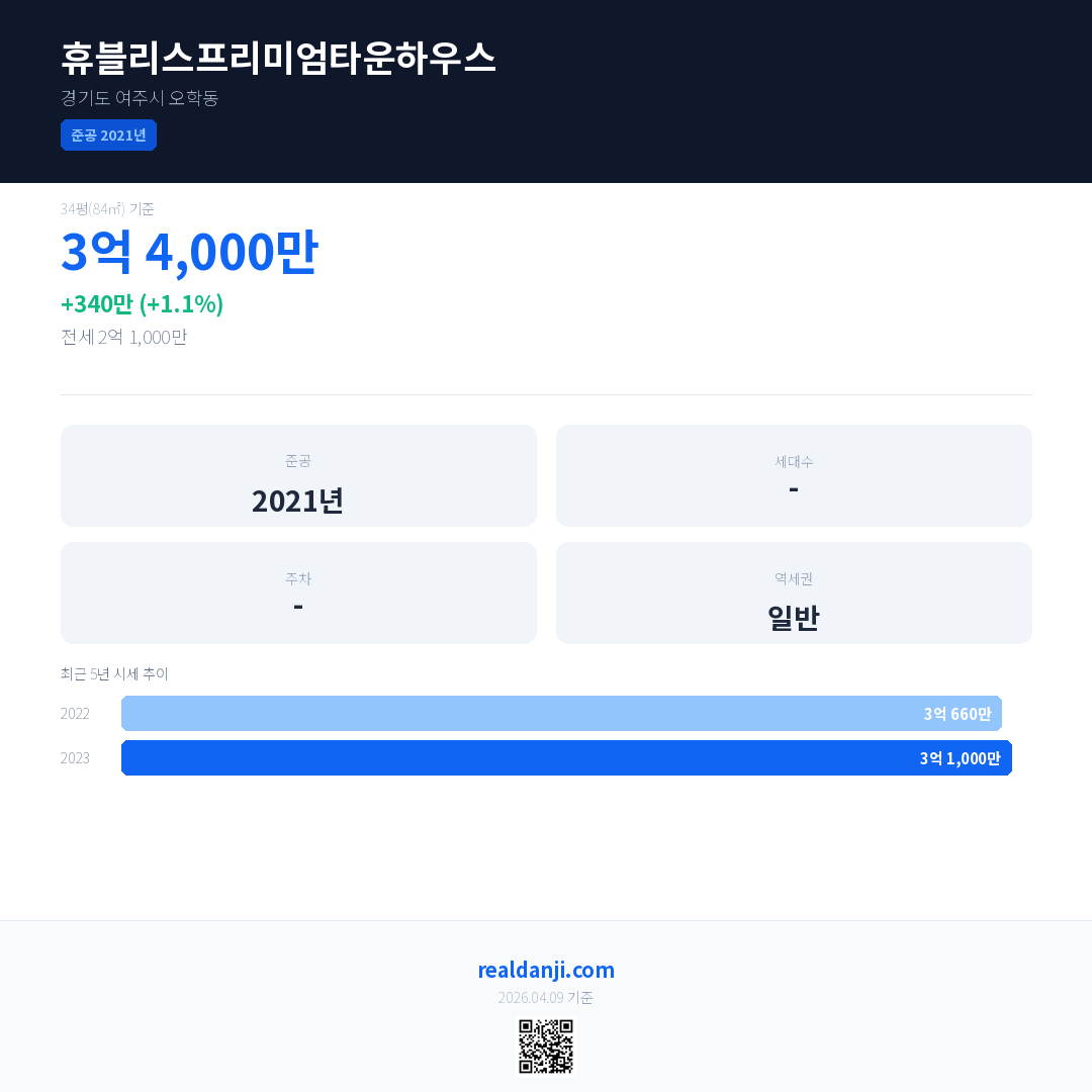 휴블리스프리미엄타운하우스 국민평형 기준 2023년 평균 거래가는 3억 1,000만으로, 전년 대비 1.1% 상승 했습니다.