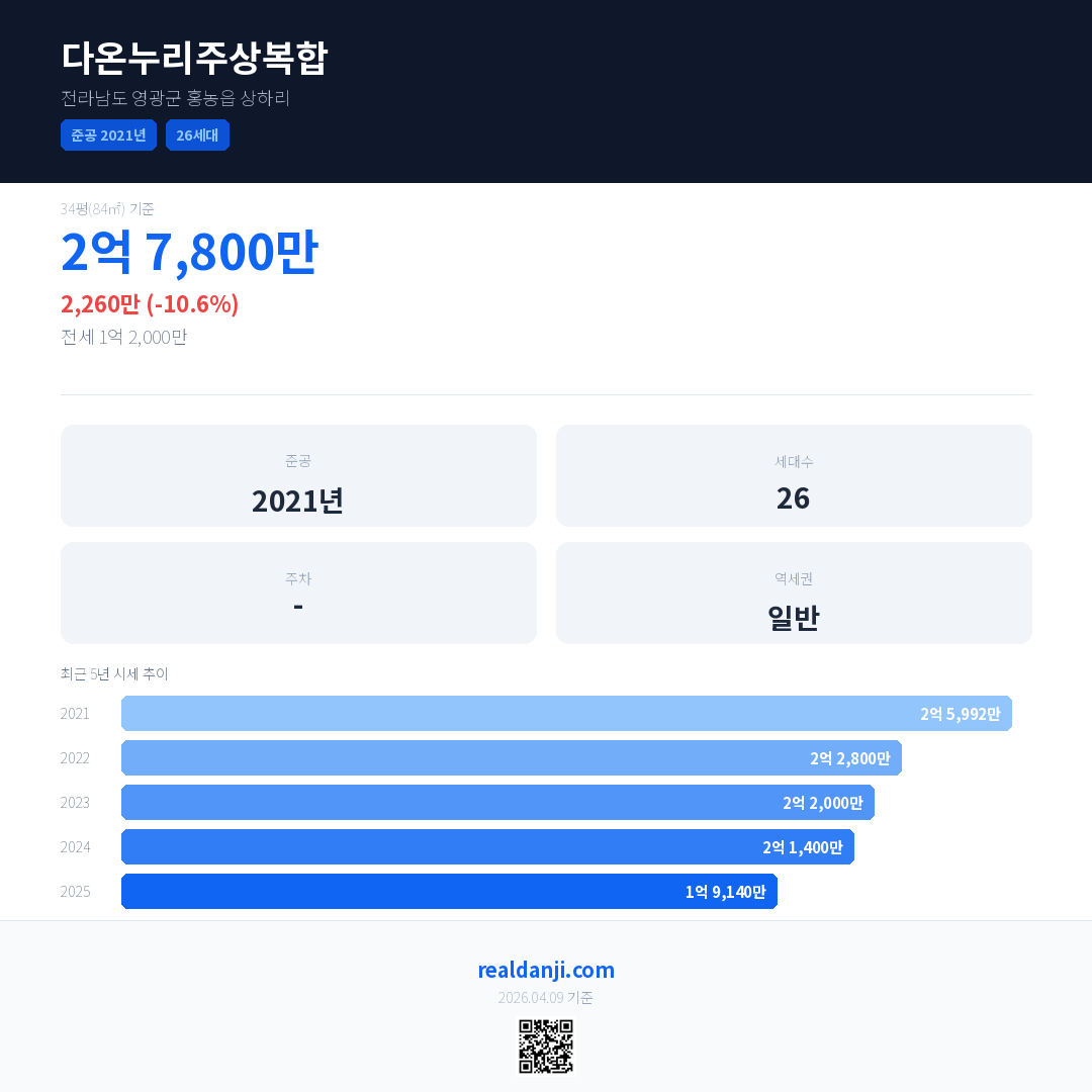다온누리주상복합은(는) 2021년에 준공되었으며, 현재 5년차입니다. 총 26세대 규모입니다.