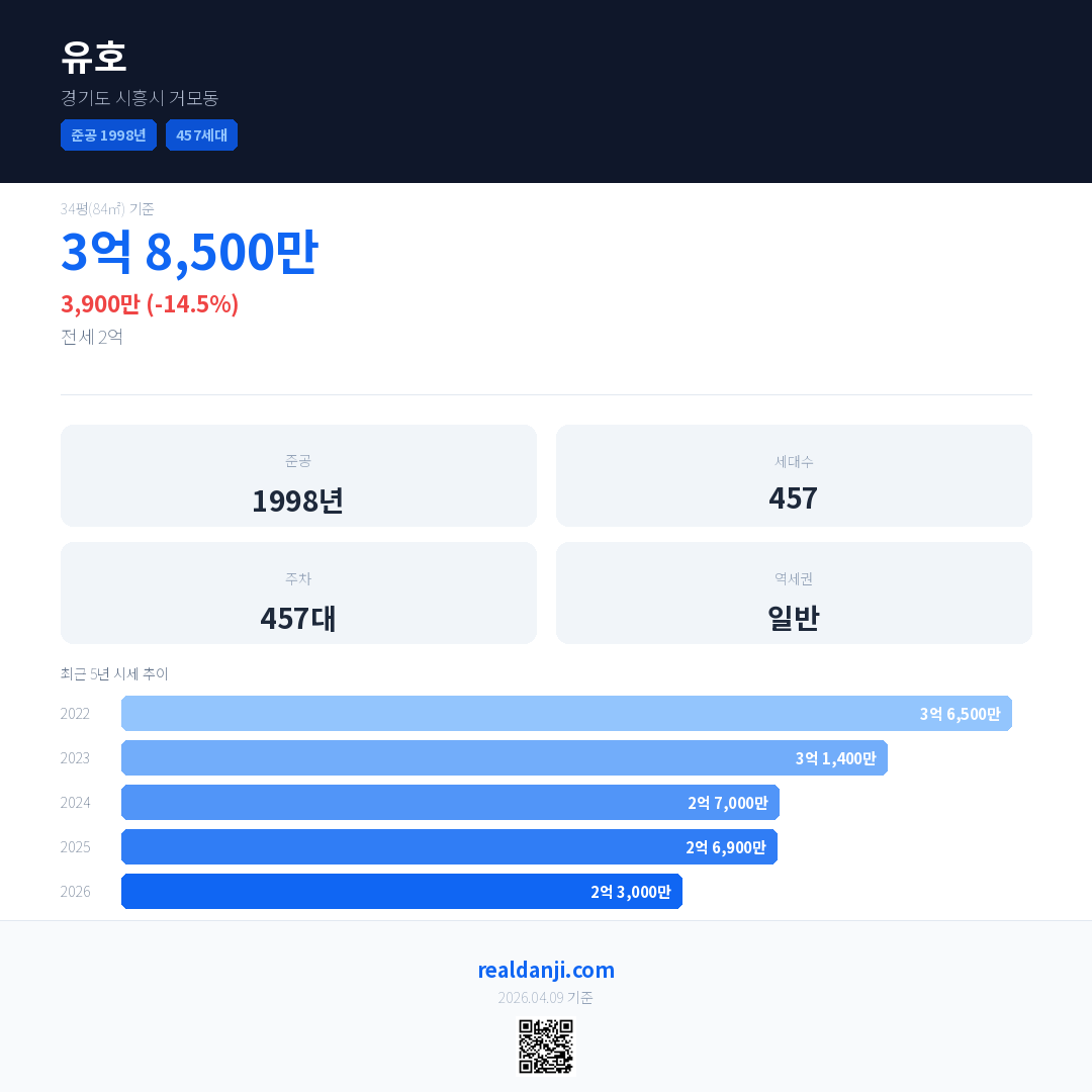 유호 국민평형 기준 2026년 평균 거래가는 2억 3,000만으로, 전년 대비 14.5% 하락 했습니다.