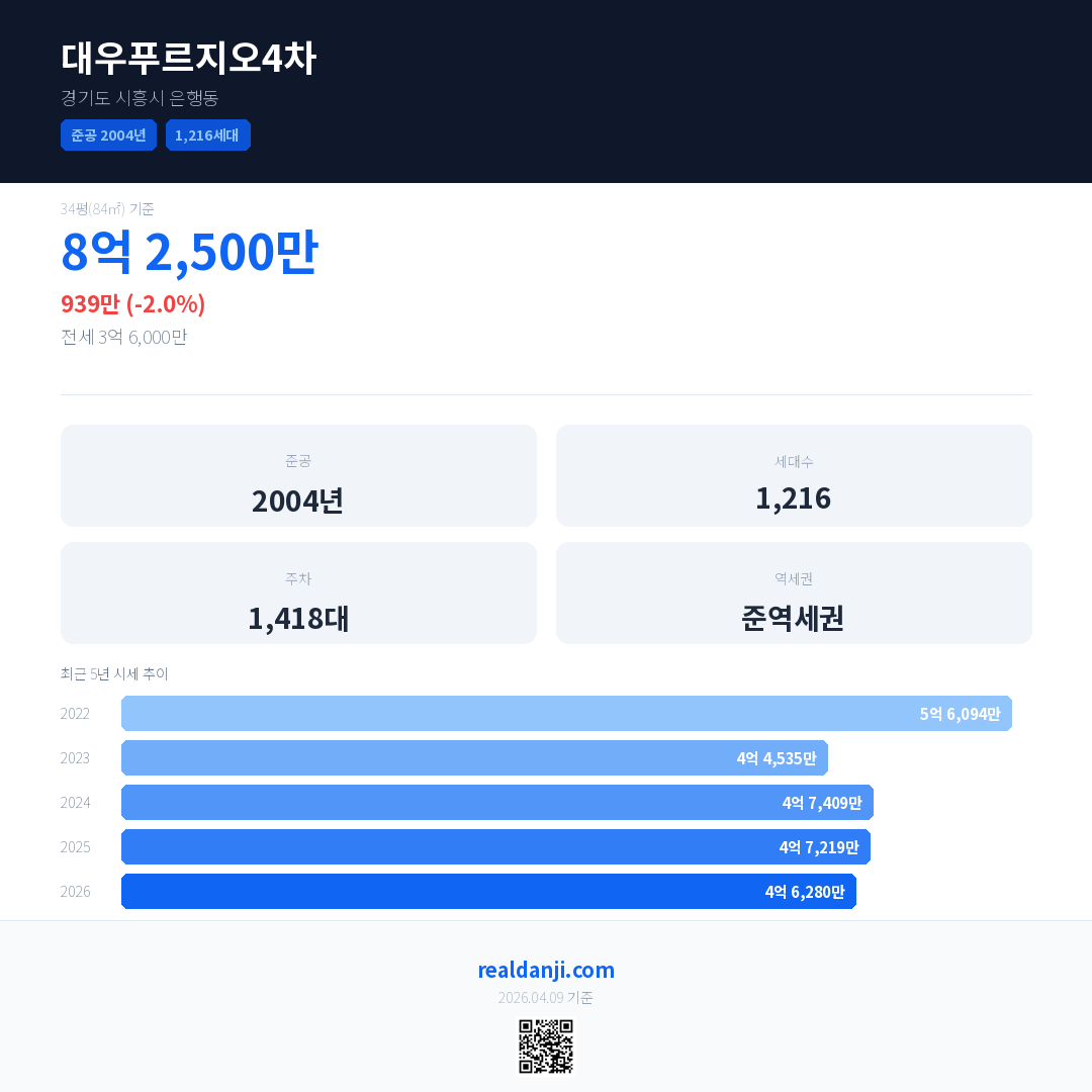 대우푸르지오4차 국민평형 기준 2026년 평균 거래가는 4억 6,280만으로, 전년 대비 2.0% 하락 했습니다.
