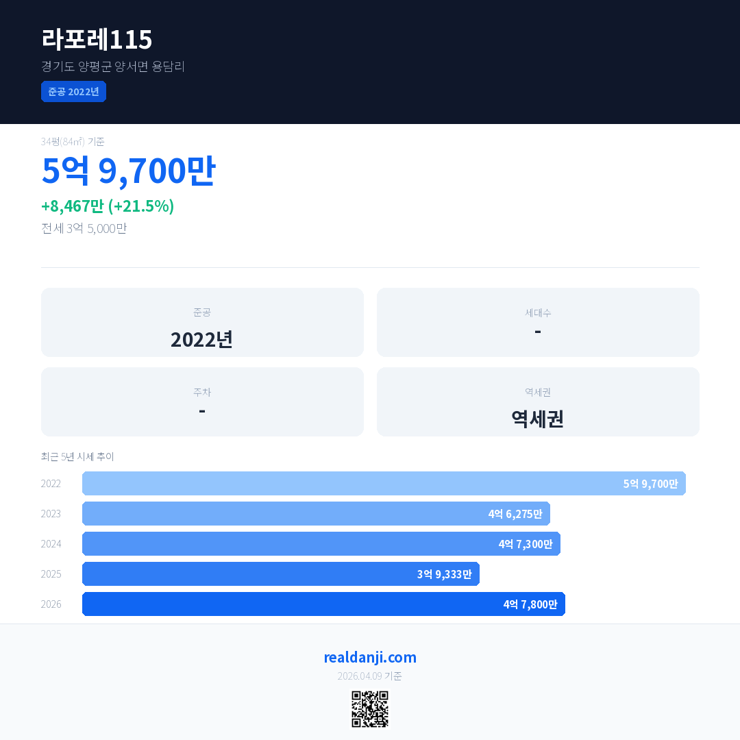 라포레115 국민평형 기준 2026년 평균 거래가는 4억 7,800만으로, 전년 대비 21.5% 상승 했습니다.