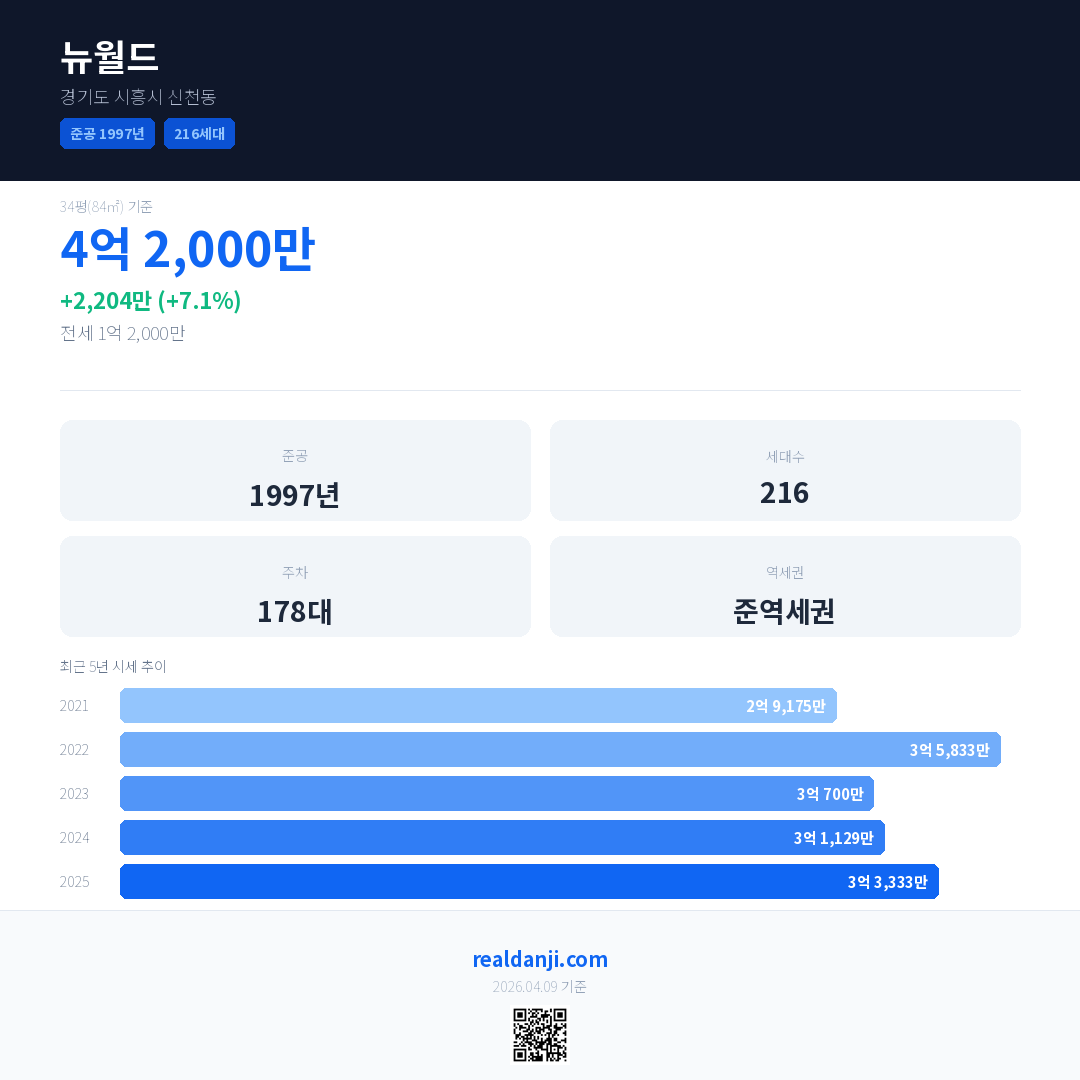 뉴월드 국민평형 기준 2025년 평균 거래가는 3억 3,333만으로, 전년 대비 7.1% 상승 했습니다.
