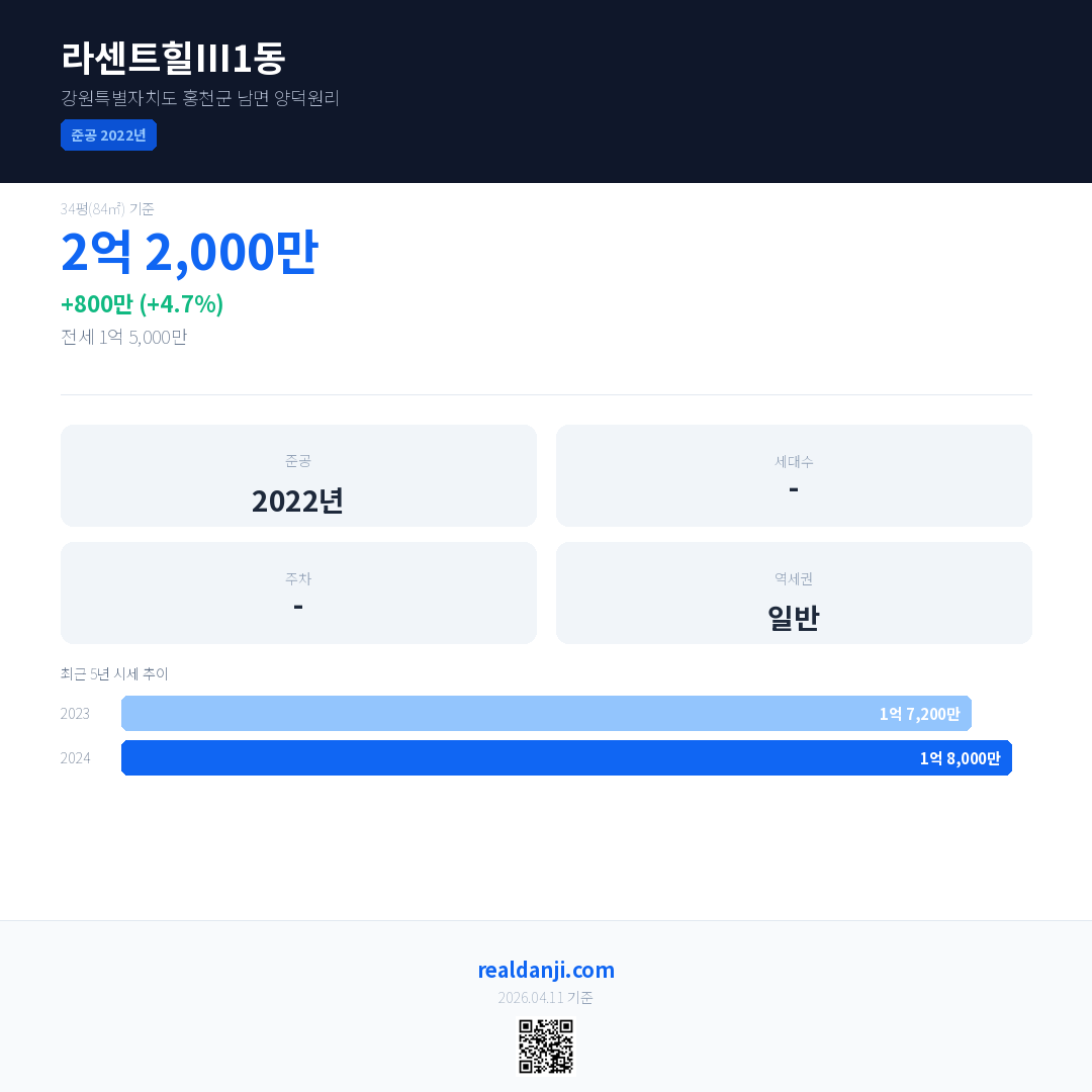 라센트힐Ⅲ1동 최근 거래가는 2억 2,000만입니다. (2024-10)