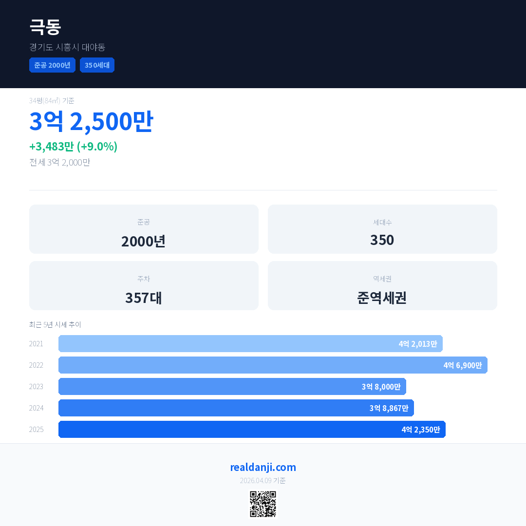 극동 국민평형 기준 2025년 평균 거래가는 4억 2,350만으로, 전년 대비 9.0% 상승 했습니다.