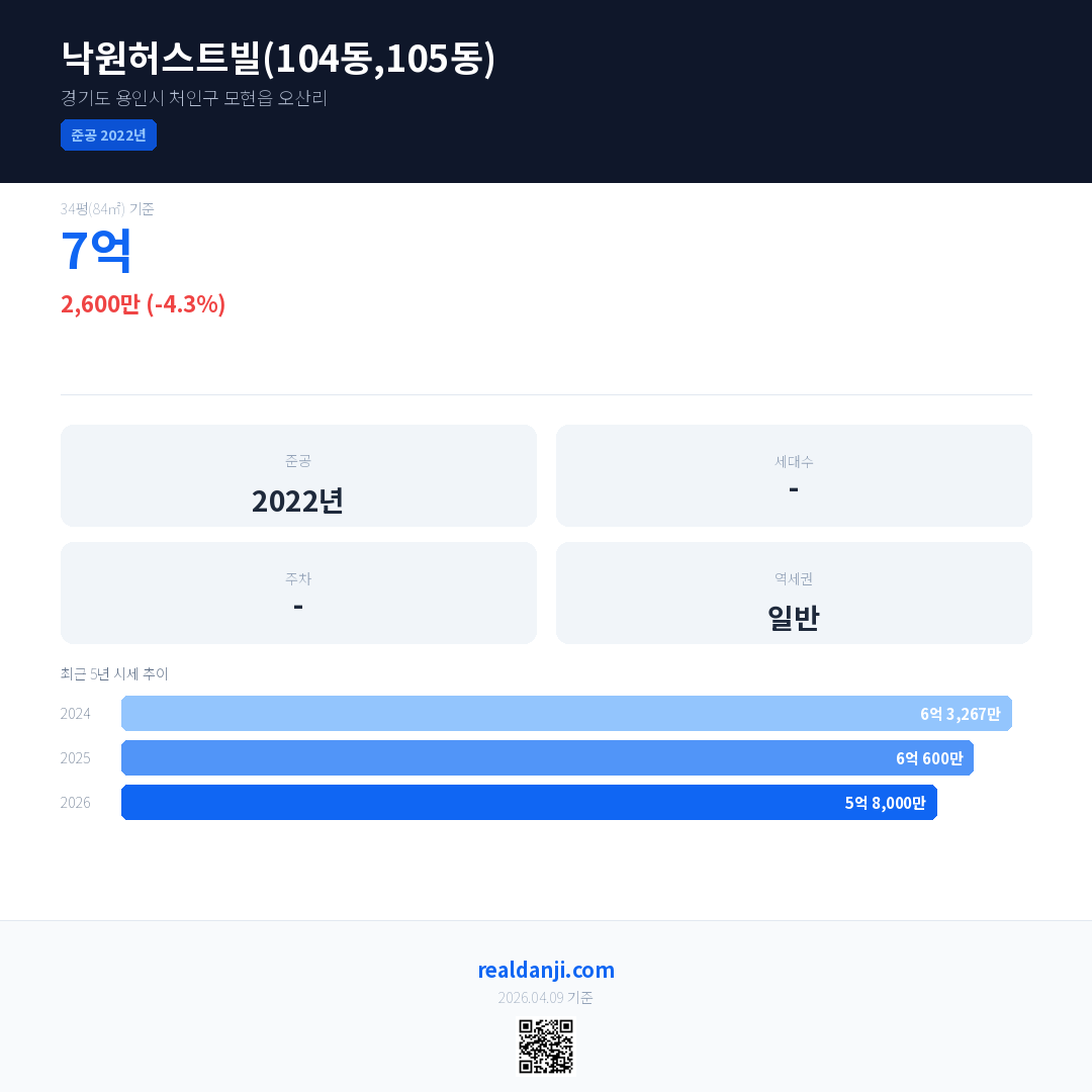 낙원허스트빌(104동,105동) 국민평형 기준 2026년 평균 거래가는 5억 8,000만으로, 전년 대비 4.3% 하락 했습니다.