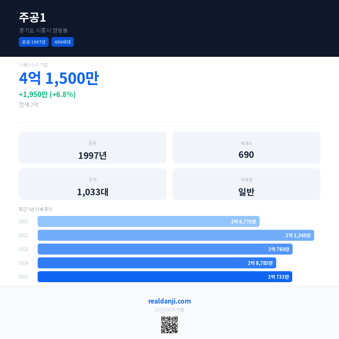 주공1은(는) 1997년에 준공되었으며, 현재 29년차입니다. 총 690세대 규모입니다.