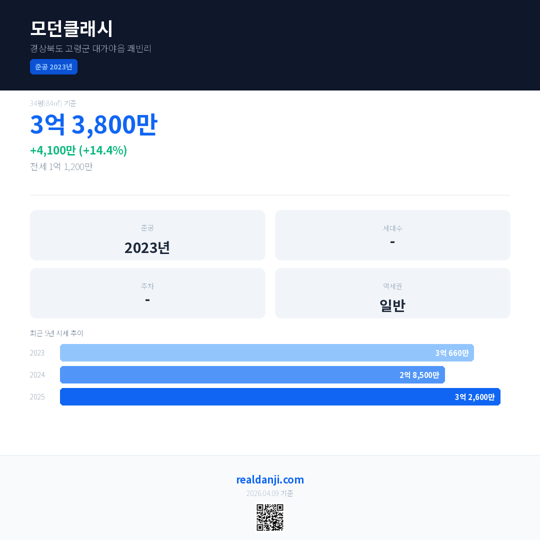 모던클래시 국민평형 기준 2025년 평균 거래가는 3억 2,600만으로, 전년 대비 14.4% 상승 했습니다.