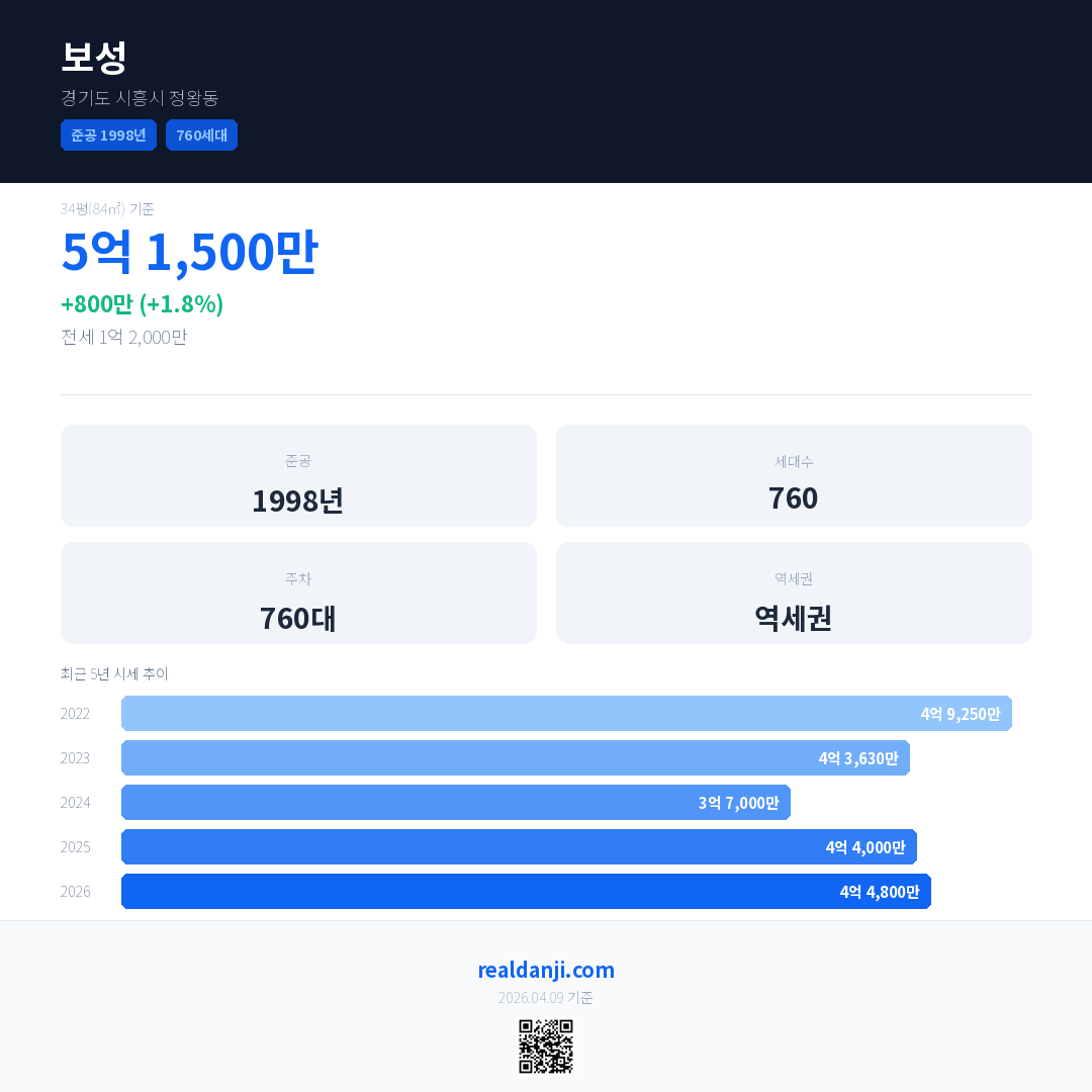 보성은(는) 1998년에 준공되었으며, 현재 28년차입니다. 총 760세대 규모입니다.