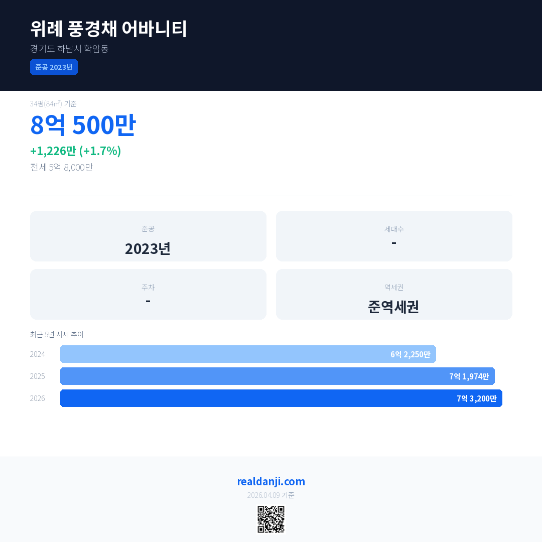 위례 풍경채 어바니티 국민평형 기준 2026년 평균 거래가는 7억 3,200만으로, 전년 대비 1.7% 상승 했습니다.