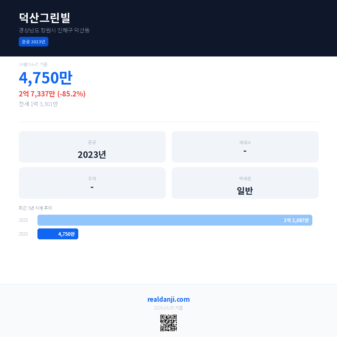 덕산그린빌 국민평형 기준 2025년 평균 거래가는 4,750만으로, 전년 대비 85.2% 하락 했습니다.