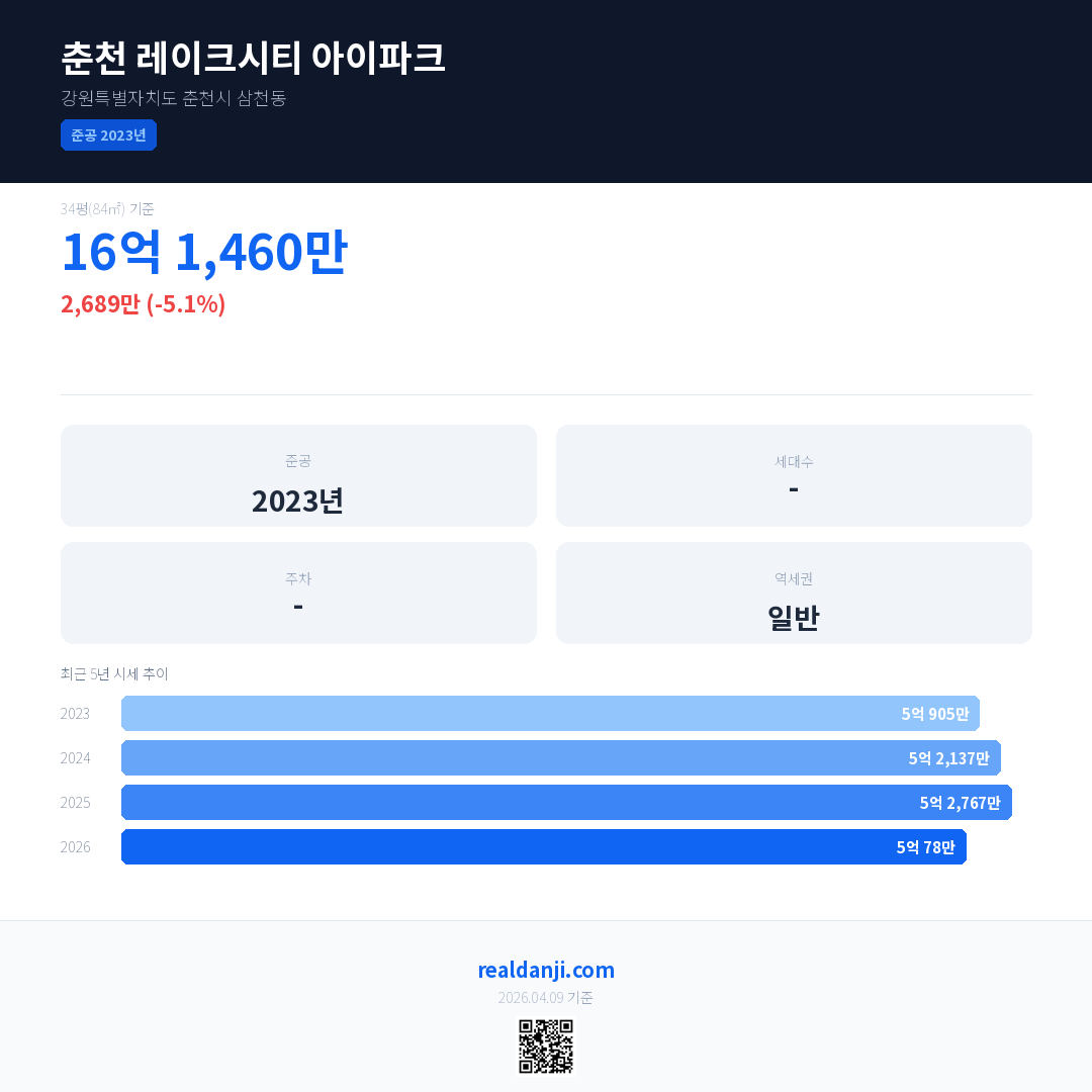 춘천 레이크시티 아이파크 국민평형 기준 2026년 평균 거래가는 5억 78만으로, 전년 대비 5.1% 하락 했습니다.