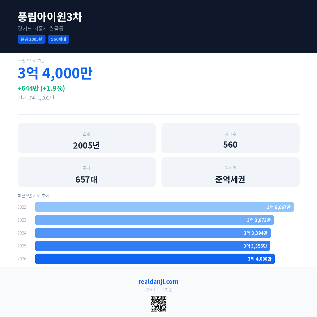 풍림아이원3차 국민평형 기준 2026년 평균 거래가는 3억 4,000만으로, 전년 대비 1.9% 상승 했습니다.