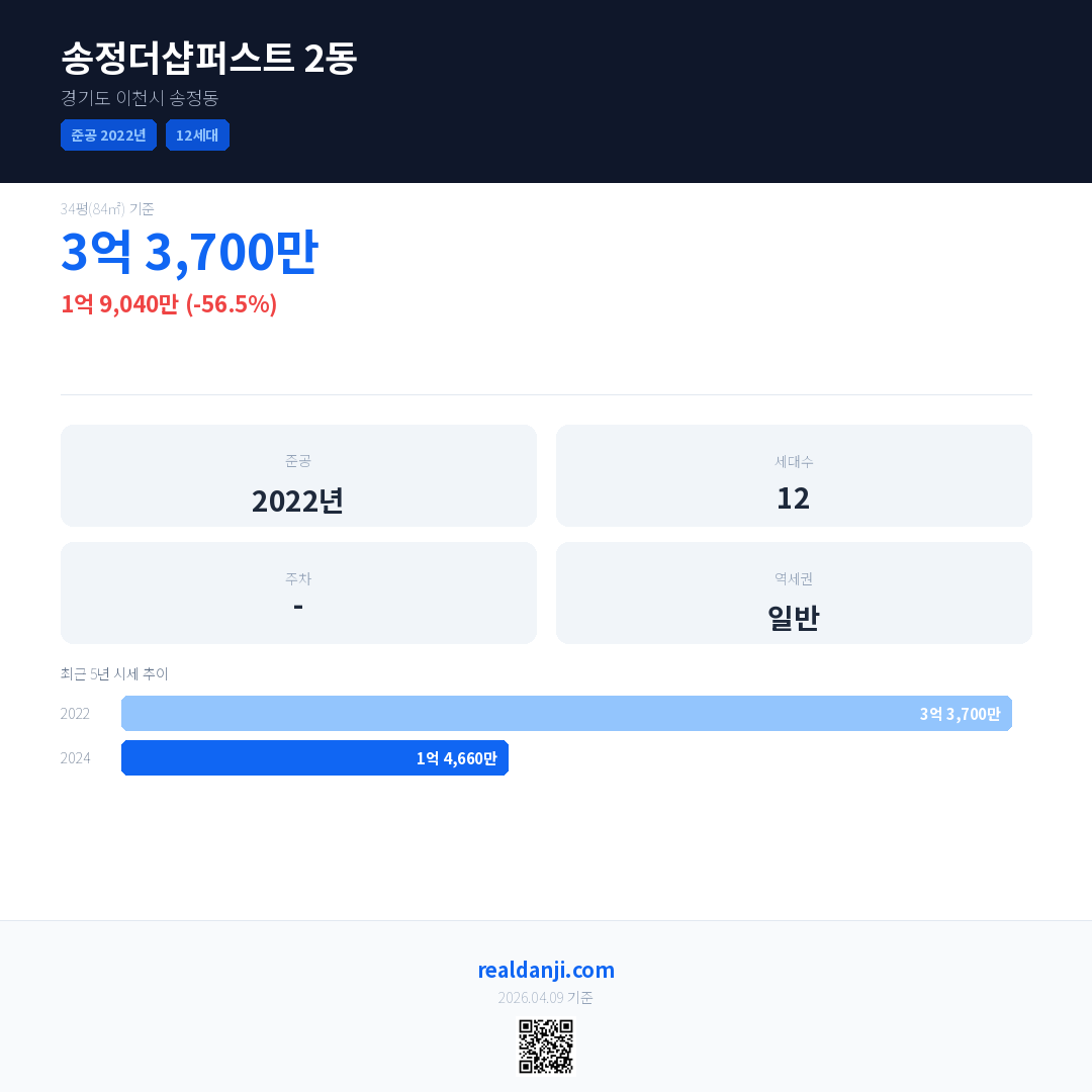 송정더샵퍼스트 2동은(는) 2022년에 준공되었으며, 현재 4년차입니다. 총 12세대 규모입니다.