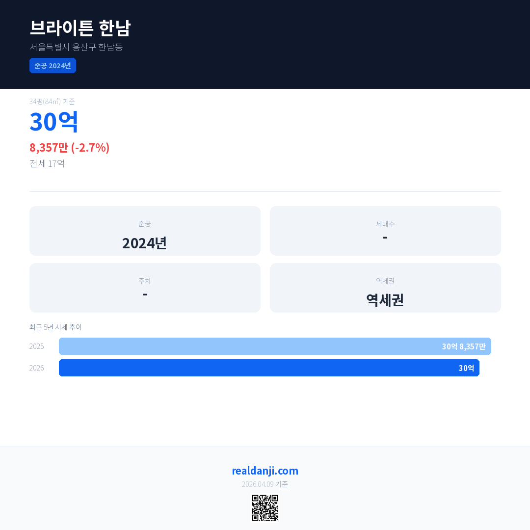 브라이튼 한남 국민평형 기준 2026년 평균 거래가는 30억으로, 전년 대비 2.7% 하락 했습니다.