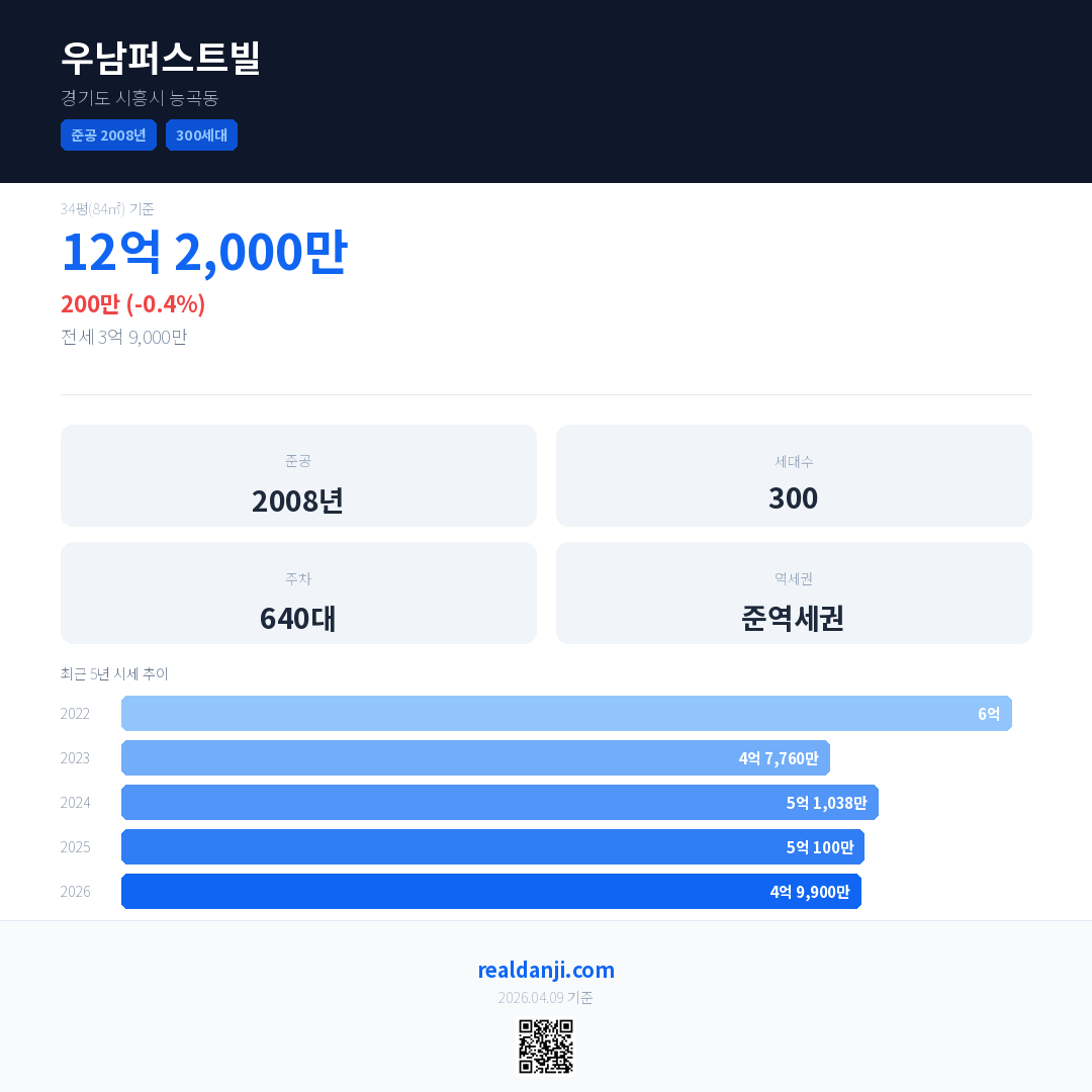 우남퍼스트빌 국민평형 기준 2026년 평균 거래가는 4억 9,900만으로, 전년 대비 0.4% 하락 했습니다.