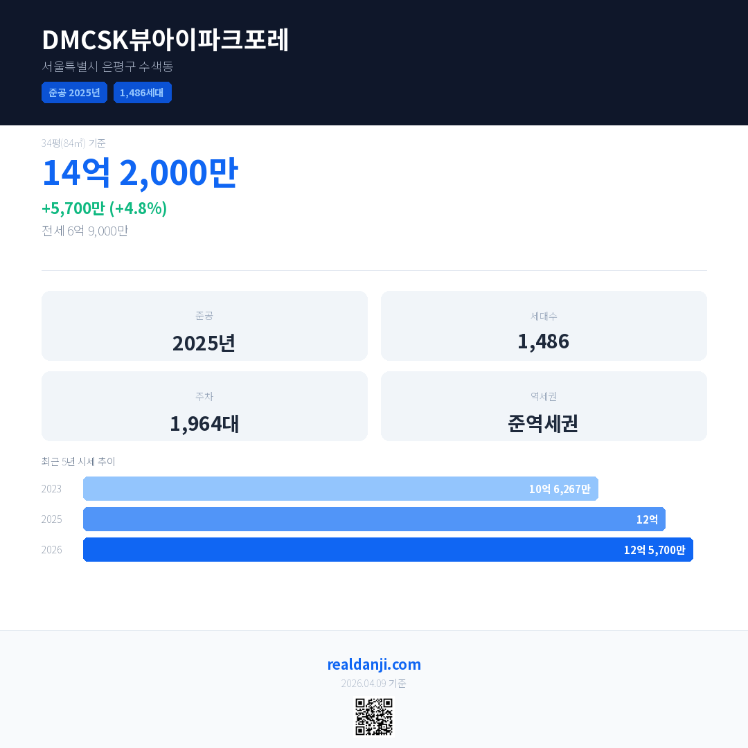 DMCSK뷰아이파크포레은(는) 2025년에 준공되었으며, 현재 1년차입니다. 총 1,486세대 규모입니다.