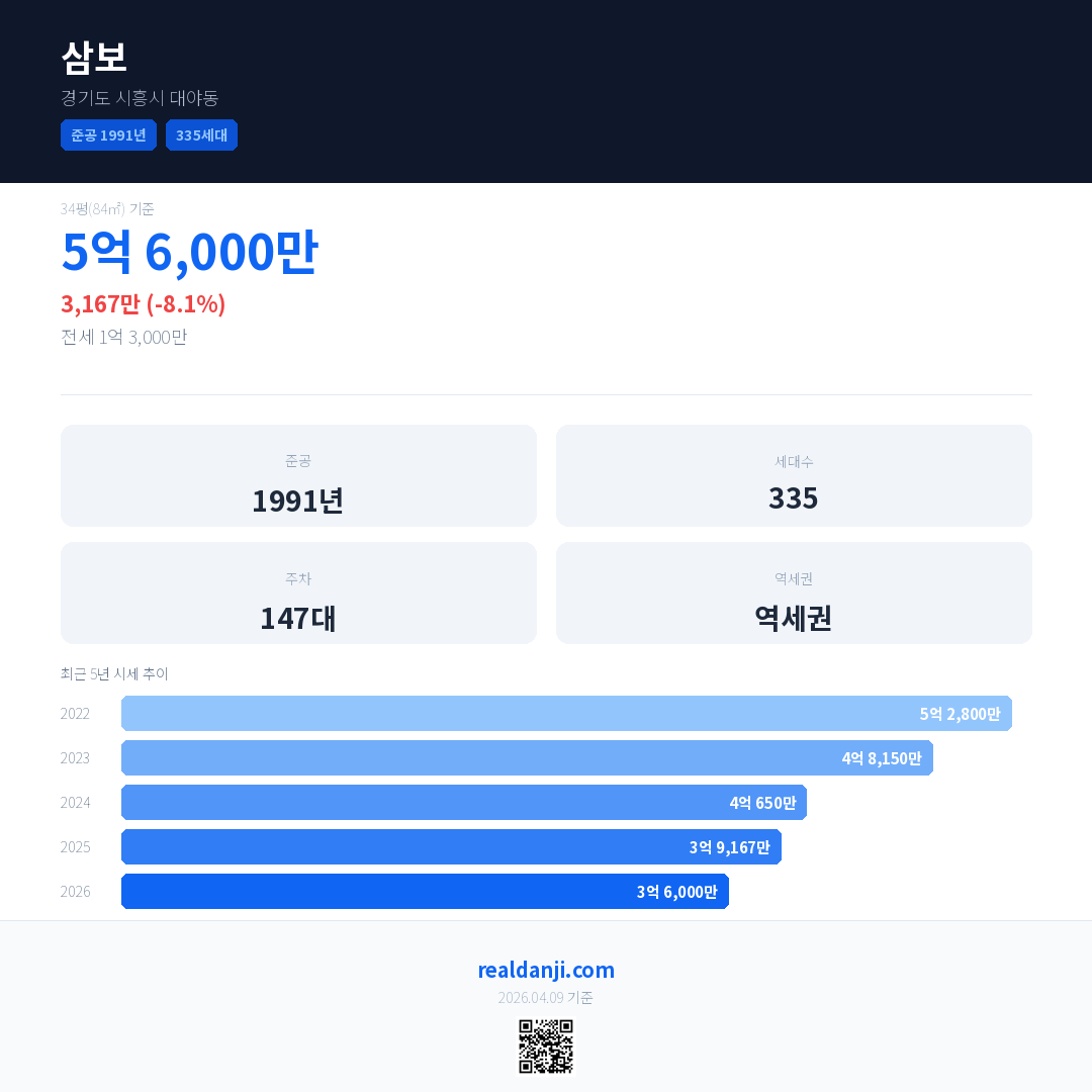 삼보은(는) 1991년에 준공되었으며, 현재 35년차입니다. 총 335세대 규모입니다.