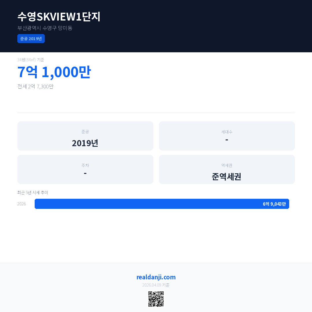 수영SKVIEW1단지은(는) 2019년에 준공되었으며, 현재 7년차입니다.