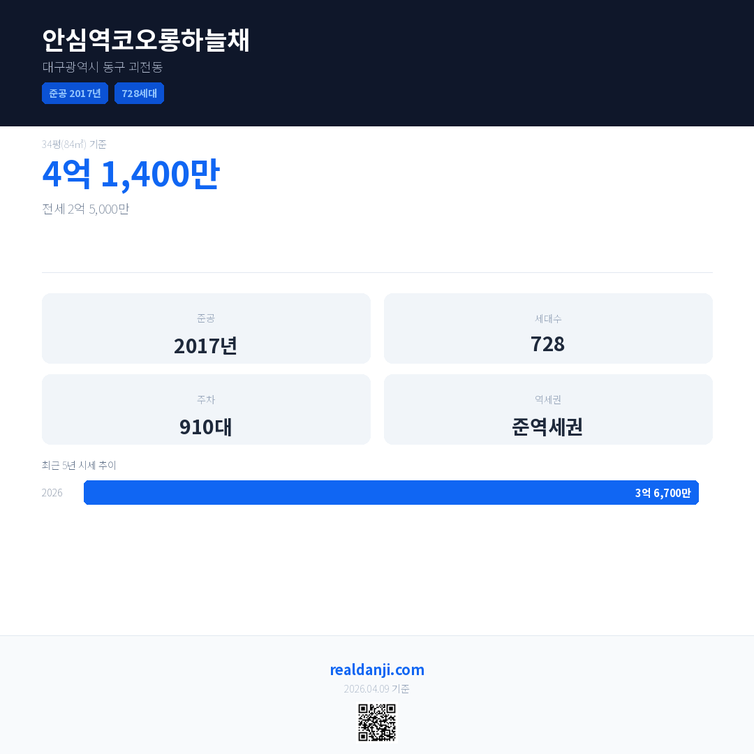 안심역코오롱하늘채 최근 거래가는 3억 3,000만입니다. (2026-04)