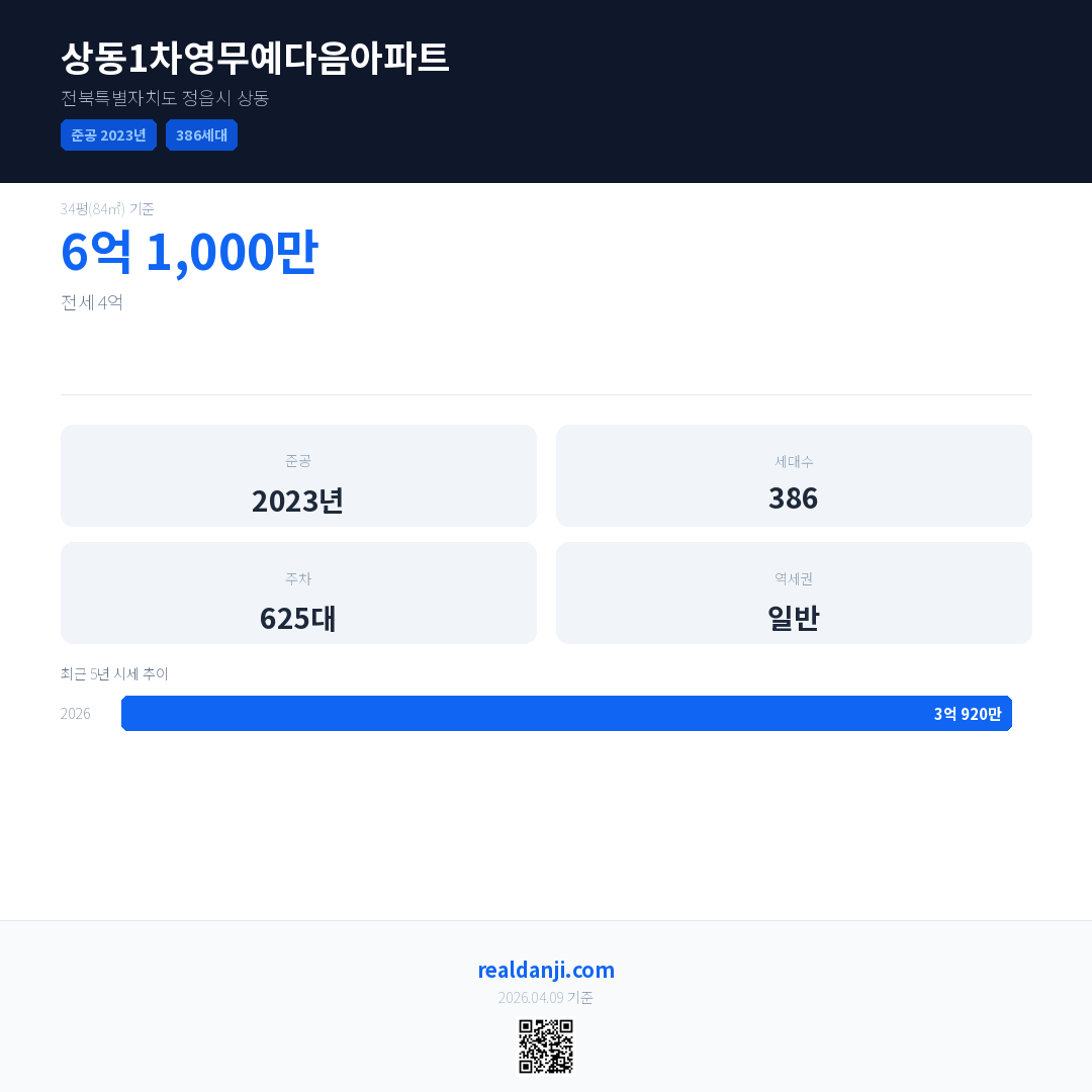 상동1차영무예다음아파트은(는) 2023년에 준공되었으며, 현재 3년차입니다. 총 386세대 규모입니다.