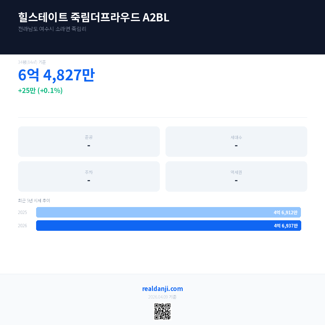 힐스테이트 죽림더프라우드 A2BL 국민평형 기준 2026년 평균 거래가는 4억 6,937만으로, 전년 대비 0.1% 상승 했습니다.
