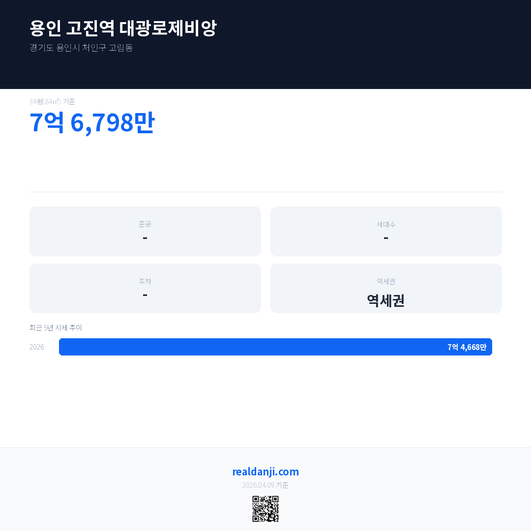 용인 고진역 대광로제비앙 최근 거래가는 6억 7,200만입니다. (2026-04)