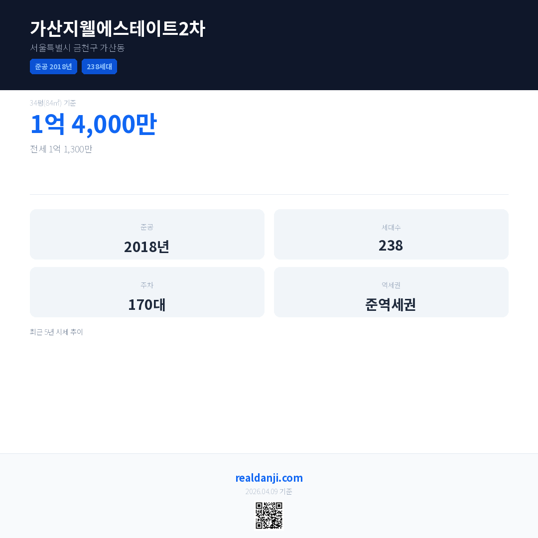 가산지웰에스테이트2차은(는) 2018년에 준공되었으며, 현재 8년차입니다. 총 238세대 규모입니다.