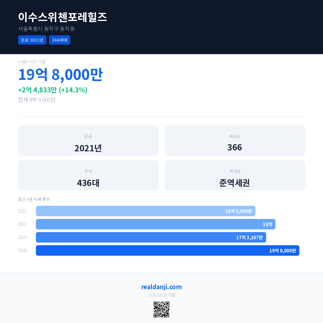 이수스위첸포레힐즈은(는) 2021년에 준공되었으며, 현재 5년차입니다. 총 366세대 규모입니다.