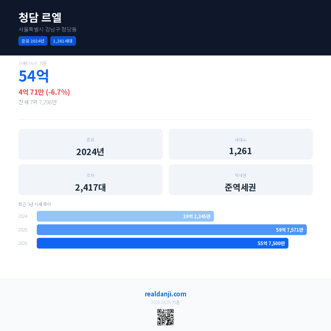 청담 르엘 국민평형 기준 2026년 평균 거래가는 55억 7,500만으로, 전년 대비 6.7% 하락 했습니다.