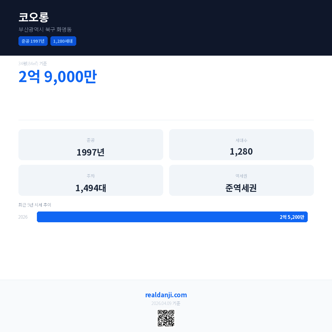 코오롱은(는) 1997년에 준공되었으며, 현재 29년차입니다. 총 1,280세대 규모입니다.