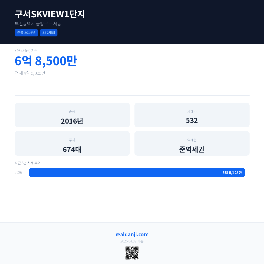 구서SKVIEW1단지 최근 거래가는 6억 8,500만입니다. (2026-03)
