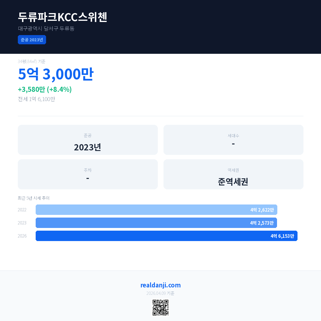 두류파크KCC스위첸 국민평형 기준 2026년 평균 거래가는 4억 6,153만으로, 전년 대비 8.4% 상승 했습니다.
