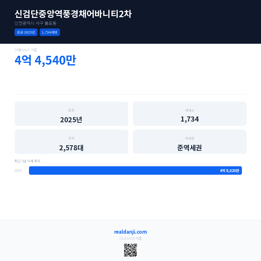 신검단중앙역풍경채어바니티2차은(는) 2025년에 준공되었으며, 현재 1년차입니다. 총 1,734세대 규모입니다.