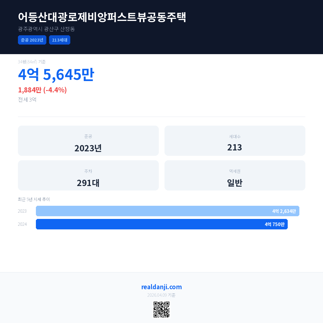 어등산대광로제비앙퍼스트뷰공동주택 국민평형 기준 2024년 평균 거래가는 4억 750만으로, 전년 대비 4.4% 하락 했습니다.