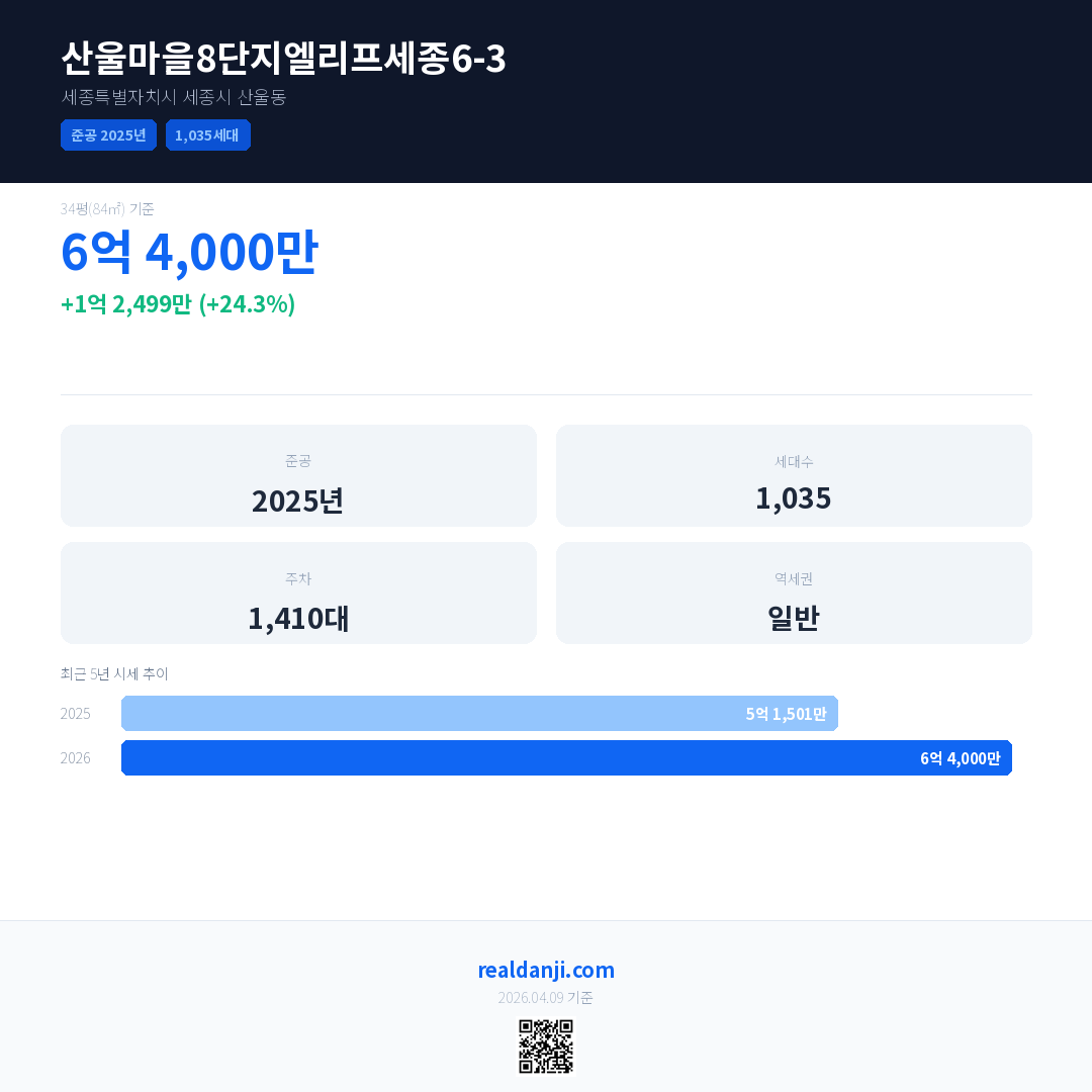 산울마을8단지엘리프세종6-3 국민평형 기준 2026년 평균 거래가는 6억 4,000만으로, 전년 대비 24.3% 상승 했습니다.