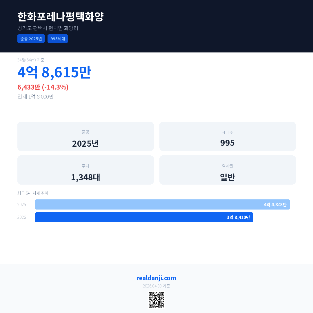 한화포레나평택화양 최근 거래가는 4억 8,615만입니다. (2026-02)