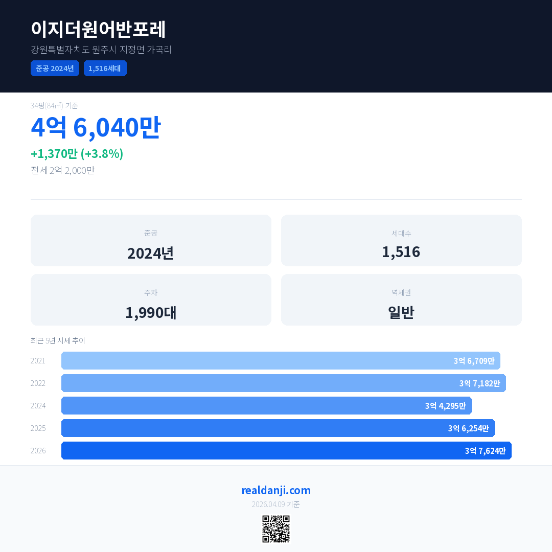 이지더원어반포레 국민평형 기준 2026년 평균 거래가는 3억 7,624만으로, 전년 대비 3.8% 상승 했습니다.